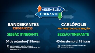 ALEP Na quinta-feira (4), os deputados estaduais chegam à Expoban 2025, em Bandeirantes, e, na sexta-feira (5), estarão em Carlópolis, durante a XIV Frutfest 2025. Pedro Sarolli Créditos: Arte: Anne Botero A Assembleia Legislativa do Paraná promove, nesta primeira semana de setembro, a 28ª e a 29ª edições da Assembleia Itinerante, programa de interiorização do Parlamento Estadual. Na quinta-feira (4), os deputados estaduais chegam à Expoban 2025, em Bandeirantes, e, na sexta-feira (5), estarão em Carlópolis, durante…