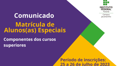 IFPR/PR As Coordenações de Cursos de Graduação do IFPR Campus Jacarezinho comunicam que estarão abertas, entre os dias 25 a 26 de julho de 2023, as inscrições para Seleção de Alunos(as) Especiais para os componentes dos cursos de graduação do campus, para ingresso no segundo semestre letivo de 2023 (2023-2). Desta forma, será possível um(a) estudante regularmente matriculado(a) em curso de graduação do IFPR, cursar componentes curriculares em outro curso de graduação do IFPR, campus Jacarezinho. As…