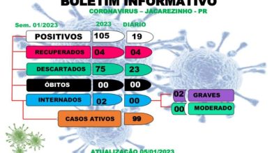 Da Redação Atualização do boletim epidemiológico da secretaria municipal de Saúde de Jacarezinho traz mais 19 casos de Covid-19 nesta quinta-feira (05).A publicação também indica 23 casos descartados e quatro pacientes recuperados. Agora são 99 casos ativos, com dois internados em estado grave.