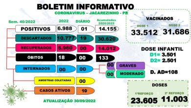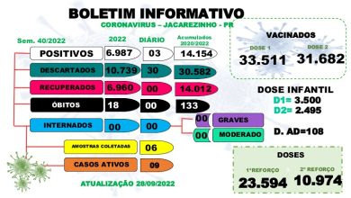 Da Redação Atualização do boletim epidemiológico da secretaria municipal de Saúde de Jacarezinho traz mais três casos de Covid-19 nesta quarta-feira (28).O informe ainda mostra 30 casos descartados. No momento são nove casos ativos, sem internações.Jacarezinho tem o total de 14.154 casos de Covid-19 desde o começo da pandemia, com 133 mortes.