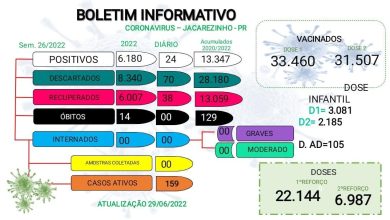 Da Redação O boletim epidemiológico da secretaria municipal de Saúde de Jacarezinho traz 24 novos casos de Covid-19 na atualização desta quarta-feira (29).O informe ainda tem o registro de 70 casos descartados e 38 pacientes recuperados. Agora são 159 casos ativos, sem internações.Jacarezinho soma 13.347 casos de Covid-19 desde o começo da pandemia, com 129 mortes.