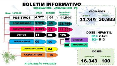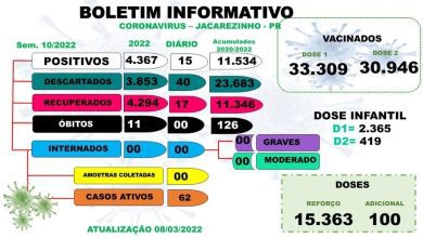 Da Redação O boletim epidemiológico da secretaria municipal de Saúde de Jacarezinho traz quatro novos casos de Covid-19 nesta quinta-feira (10). No dia registro também de 40 exames descartados e um paciente recuperado. Agora são 65 casos ativos, sem internações. Jacarezinho soma 11.544 casos de Covid-19 desde o começo da pandemia, que resultaram em 126 óbitos.