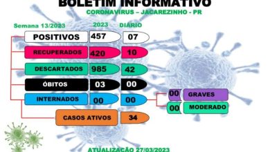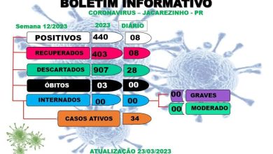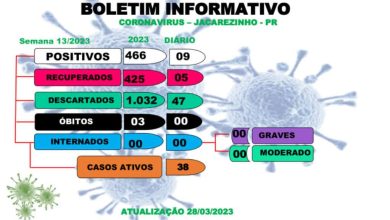 Da Redação Atualização desta quinta-feira (23) do boletim epidemiológico da secretaria municipal de Saúde de Jacarezinho traz oito novos casos de covid-19. O informe ainda registra 28 casos descartados e oito pacientes recuperados. São 34 casos ativos, sem internações.