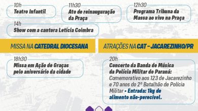 DA ASSESSORIA A prefeitura de Jacarezinho divulgou a programação oficial das comemorações do aniversário de 123 anos de emancipação política do município, que acontece neste domingo (02).As celebrações começam no sábado pela manhã (conforme programação detalhada abaixo) e seguem até a noite do domingo, com atividades diversas voltadas a diferentes públicos.Entre os destaques está a gravação do programa Tribuna da Massa ao vivo da Praça São Benedito, com a presença…