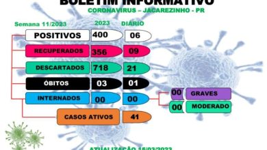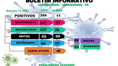 Da Redação O boletim epidemiológico da secretaria municipal de Saúde de Jacarezinho com data desta segunda-feira (13) traz 11 novos casos confirmados de covid-19.O informe ainda tem 20 casos descartados e 12 pacientes recuperados. Agora são 37 casos ativos, sem internações.