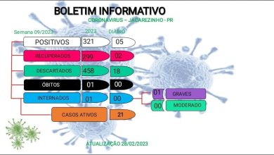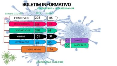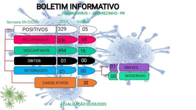 Da Redação Atualização do boletim epidemiológico da secretaria municipal de Saúde de Jacarezinho traz cinco novos casos de covid-19 nesta quinta-feira (02).O informa ainda traz 16 casos descartados e quatro pacientes recuperados. No momento são 22 casos ativos, com um deles internado em estado grave.