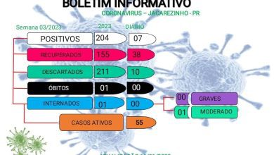-      Jacarezinho tem nove novos casos de Covid-19Da Redação A atualização do boletim epidemiológico da secretaria municipal de Saúde de Jacarezinho traz nove novos casos de Covid-19 nesta quinta-feira (12).O informe ainda registra 15 casos descartados e 18 pacientes recuperados. Agora são 89 casos ativos, com um internado. Leia mais »