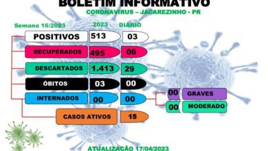 Da Redação Atualização desta terça-feira (25) do boletim epidemiológico da secretaria municipal de Saúde de Jacarezinho traz mais três casos de covid-19 registrados. O informe ainda tem 32 casos descartados e um paciente recuperado. Agora são oito casos ativos, sem internações.