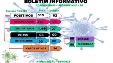 Da Redação Atualização do boletim epidemiológico da secretaria municipal de Saúde de Jacarezinho com data desta terça-feira (18) traz mais dois casos de covid-19. O informe também registra 27 casos descartados e três pacientes recuperados. Agora são 14 casos ativos, sem internações.