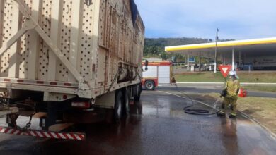 Incêndio em caminhão bitrem carregado com adubo mobiliza Corpo de Bombeiros na BR-153