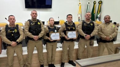 Foto PMPR Setor de Comunicação Durante sessão ordinária realizada na Câmara Municipal de Pinhalão, dois policiais militares do 2º Batalhão de Polícia Militar foram homenageados com uma Moção de Aplausos em reconhecimento à atuação heroica no combate a um incêndio ocorrido em Pinhalão. A ação rápida e eficiente dos militares foi determinante para salvar a vida de uma senhora e evitar que o fogo provocasse danos ainda maiores ao estabelecimento comercial atingido. A solenidade teve início…
