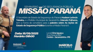 O prefeito de Jacarezinho Marcelo Palhares e o secretário de Segurança Pública Coronel Hudson, convidam você para o Seminário de Segurança Pública a ser realizado no dia 18 de setembro no Cine Iguaçu em Jacarezinho, às 9hrs. Pauta: Projeto Missão Paraná.Sua presença é muito importante!!!!Faça sua inscrição no link abaixo:https://forms.gle/FG7RmZBhe5Zyc3EM9
