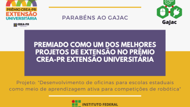 IFPR Os professores e estudantes participantes do Laboratório Maker GaJac (Garagem dos Jacarezinho) do IFPR Campus Jacarezinho submeteram um projeto de extensão ao Prêmio Crea-PR Extensão Universitária. No dia 18 de agosto foi publicado o resultado e o projeto “Desenvolvimento de oficinas para escolas estaduais como meio de aprendizagem ativa para competições de robótica” foi premiado no segundo lugar na categoria multidisciplinar. Esse projeto ocorreu no ano de 2022 e contou…