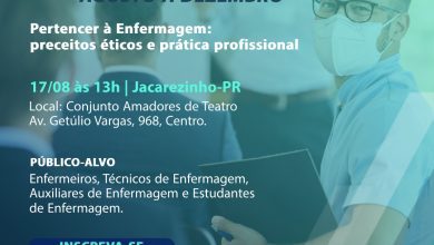 Da Redação O Coren-PR (Conselho Regional de Enfermagem do Paraná) realiza um workshop em Jacarezinho na próxima quinta-feira (17), em evento voltado a profissionais ligados à enfermagem.O workshop “Pertencer à Enfermagem: preceitos éticos e prática profissional” abordará temas como ética profissional, fortalecimento da enfermagem e prevenção aos processos éticos.O evento é gratuito e gera certificação, sendo realizado no CAT (Conjunto Amadores de Teatro) a partir das 13h. Link de inscrição:…