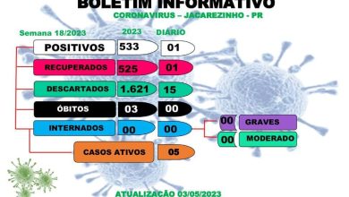 Da Redação Jacarezinho teve um novo caso de covid-19 confirmado no boletim epidemiológico da secretaria municipal de Saúde de desta quarta-feira (03).O boletim ainda traz 15 casos descartados e um paciente recuperado. Agora são cinco casos ativos, todos em isolamento domiciliar.
