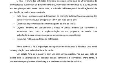 Da Assessoria O Fórum das Entidades Sindicais (FES) protocolou nesta segunda-feira, 6, ofício ao governo do Paraná pedindo uma reunião com o governador Ratinho Junior a fim de apresentar as reivindicações do conjunto de servidoras(es) do Estado.A principal delas diz respeito à data-base, ou seja, reposição dos índices inflacionários nos salários de servidoras(es). Outros pontos da pauta são a isenção de desconto previdenciário nos proventos de aposentadas(os), melhoria no atendimento…