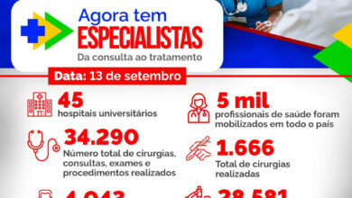 Ações envolveram cirurgias, consultas e exames. Em todo o país, houve mobilização em 45 hospitais universitários e de 5 mil profissionais de saúde para garantir 34 mil procedimentos e reduzir as filas do SUS. Próximo mutirão será em dezembro Cirurgia realizada durante o mutirão do Agora Tem Especialistas, no último sábado (13) – Foto: Walterson Rosa/MS O balanço final do mutirão de atendimentos à população para reduzir filas do Sistema…